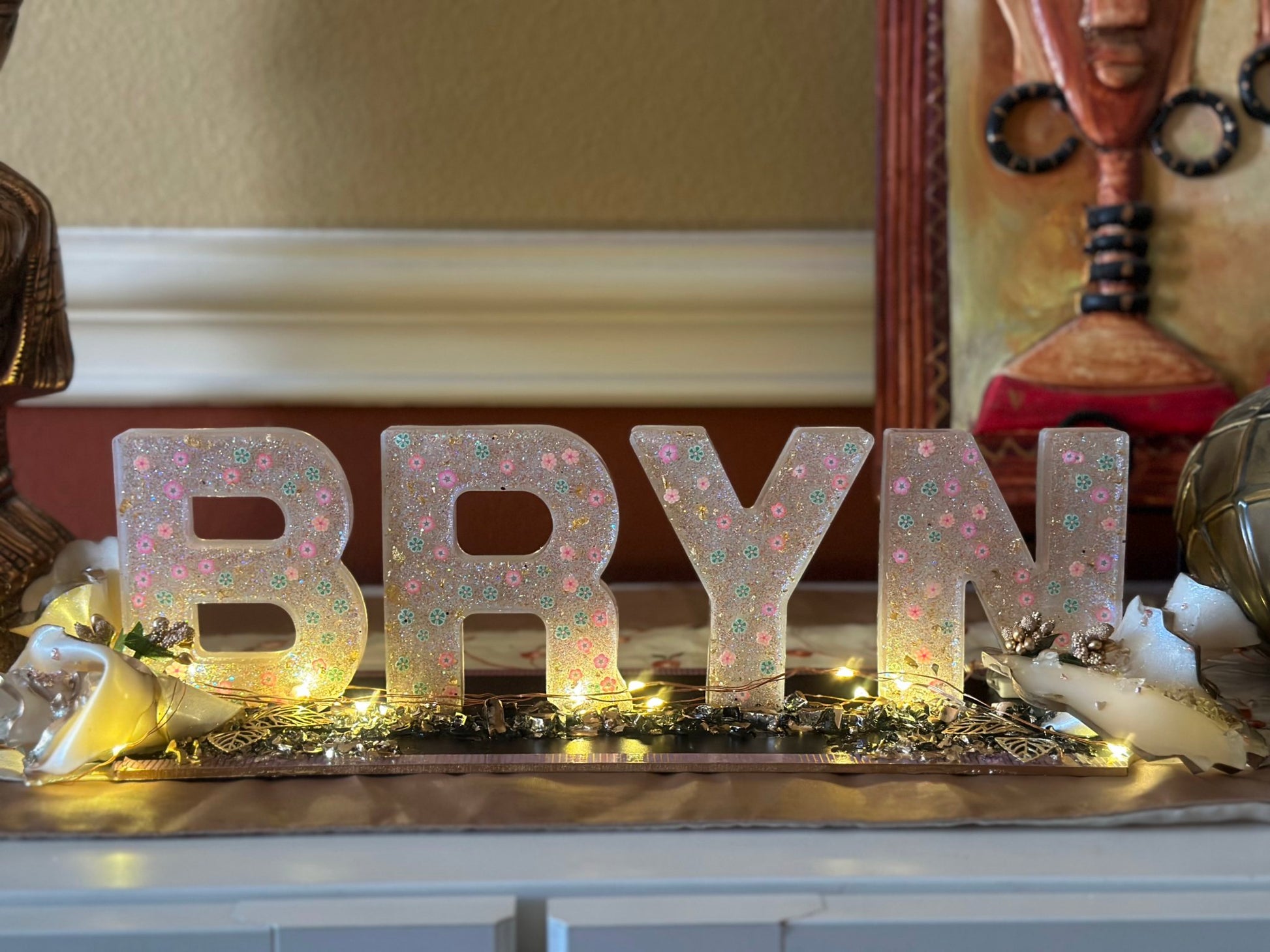 The resin letters may contain dried flowers or other resin accessories. The base plate is decorated with 3D resin flowers, artificial flowers, stones and LED lights.
