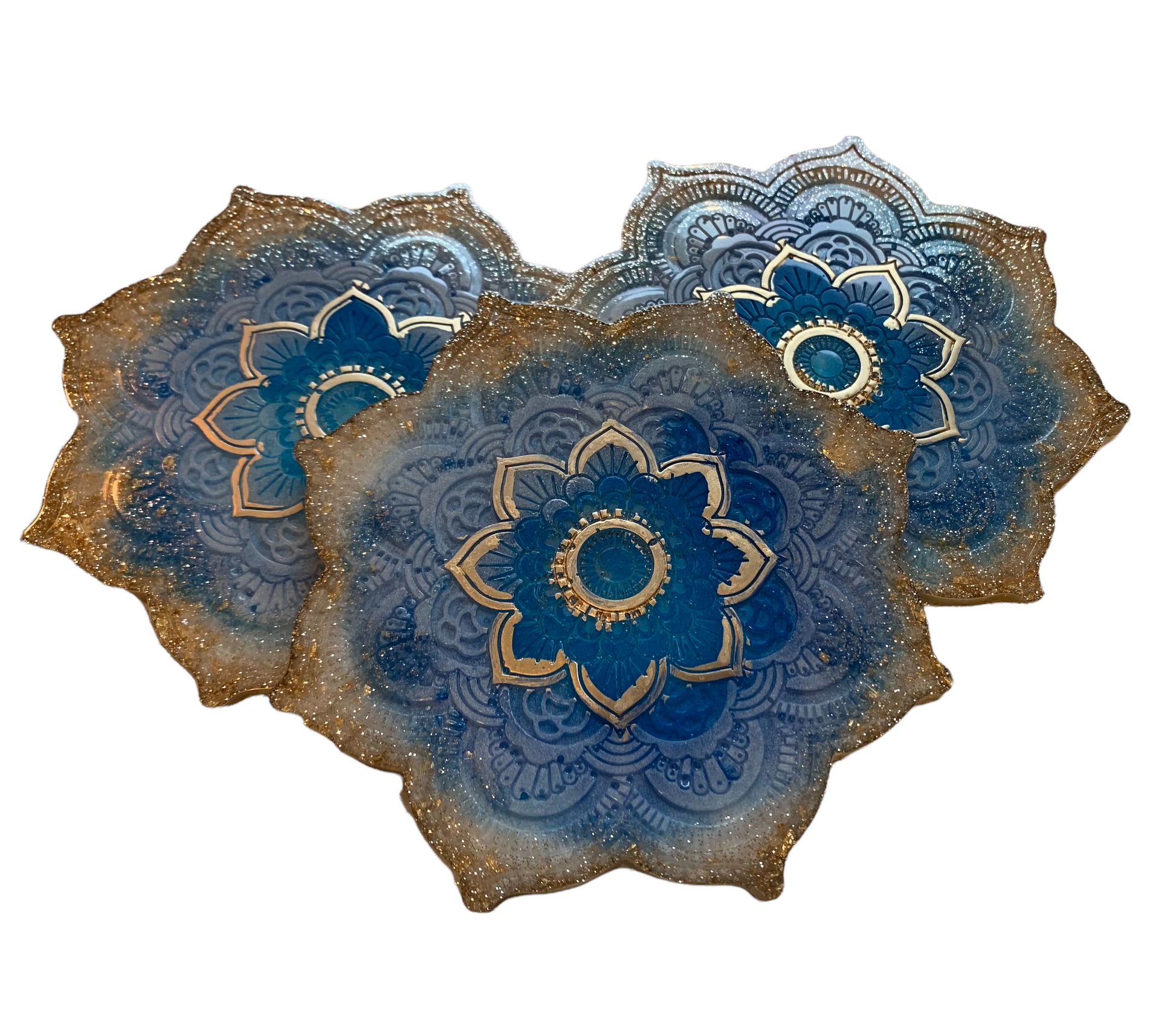 Protect your tabletops, start a conversation, with these set of four beautiful coasters. The coasters are made out of resin and colored pigments. They are available in different colors.