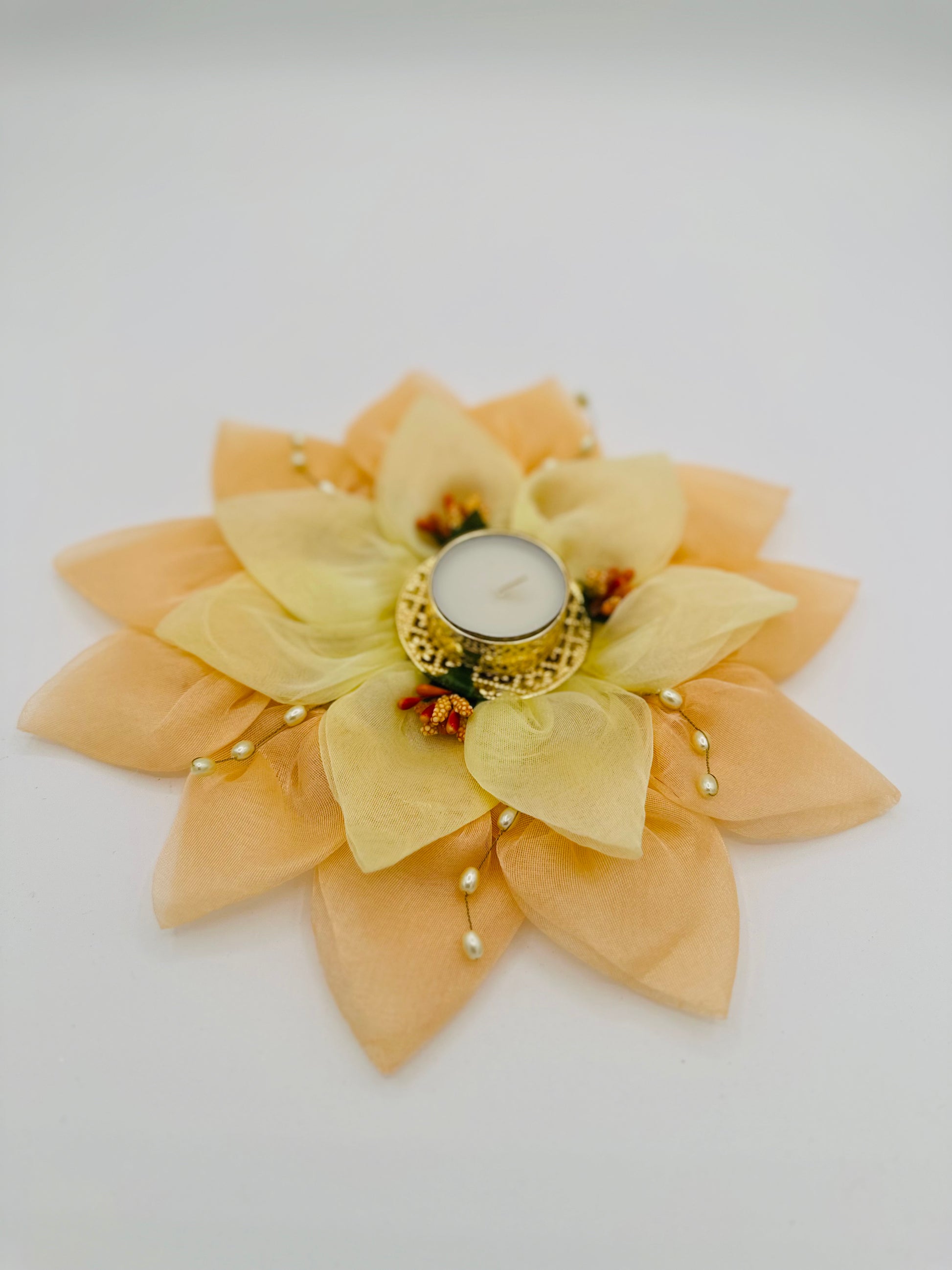 Illuminate your home this festive season with this elegant, brightly colored, diyas made of organza tissue! Use it as a centerpiece for any festive occasions like Diwali, Housewarming, Puja or Weddings. These fabric diyas will not fail to bring a happy glow to your home.
